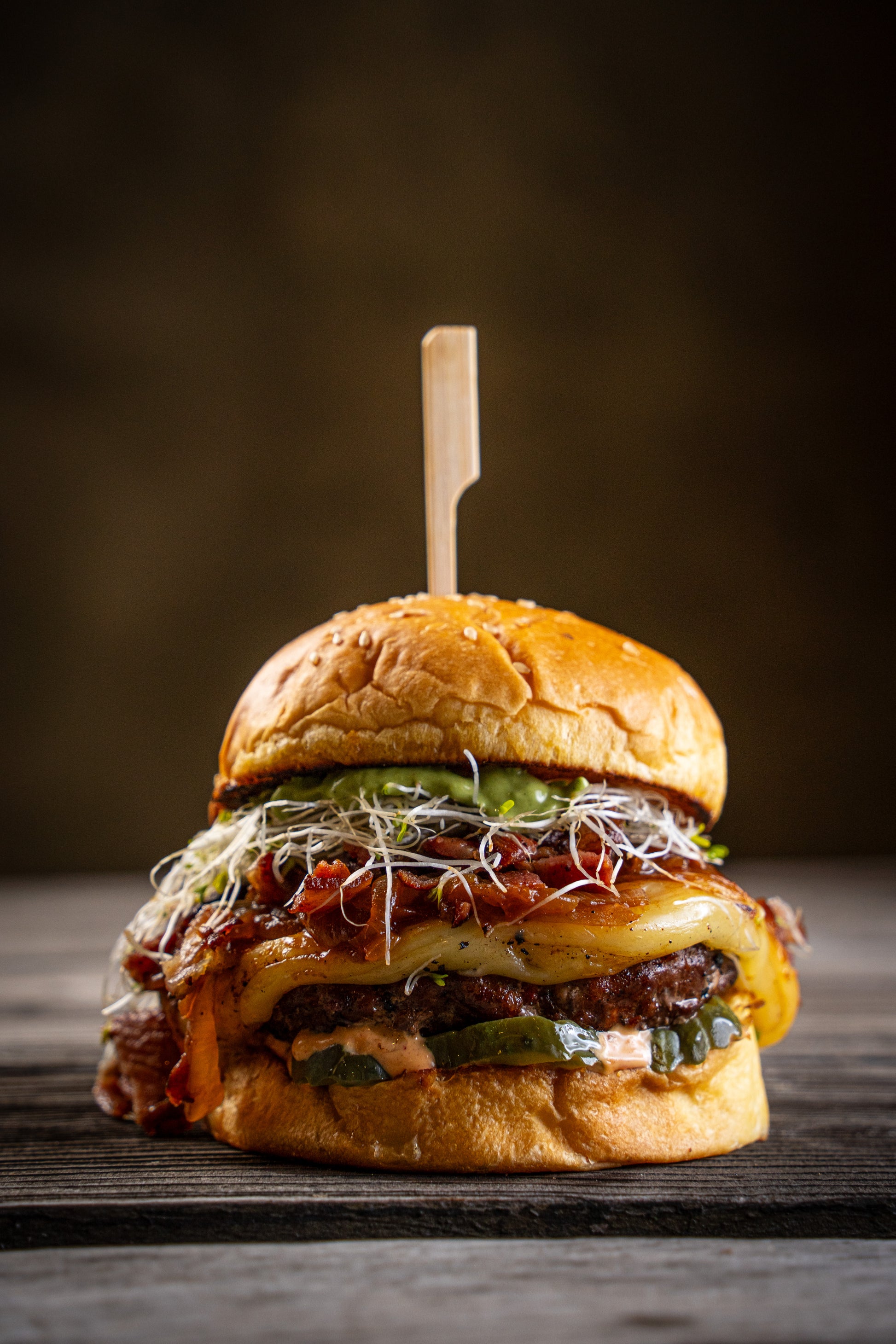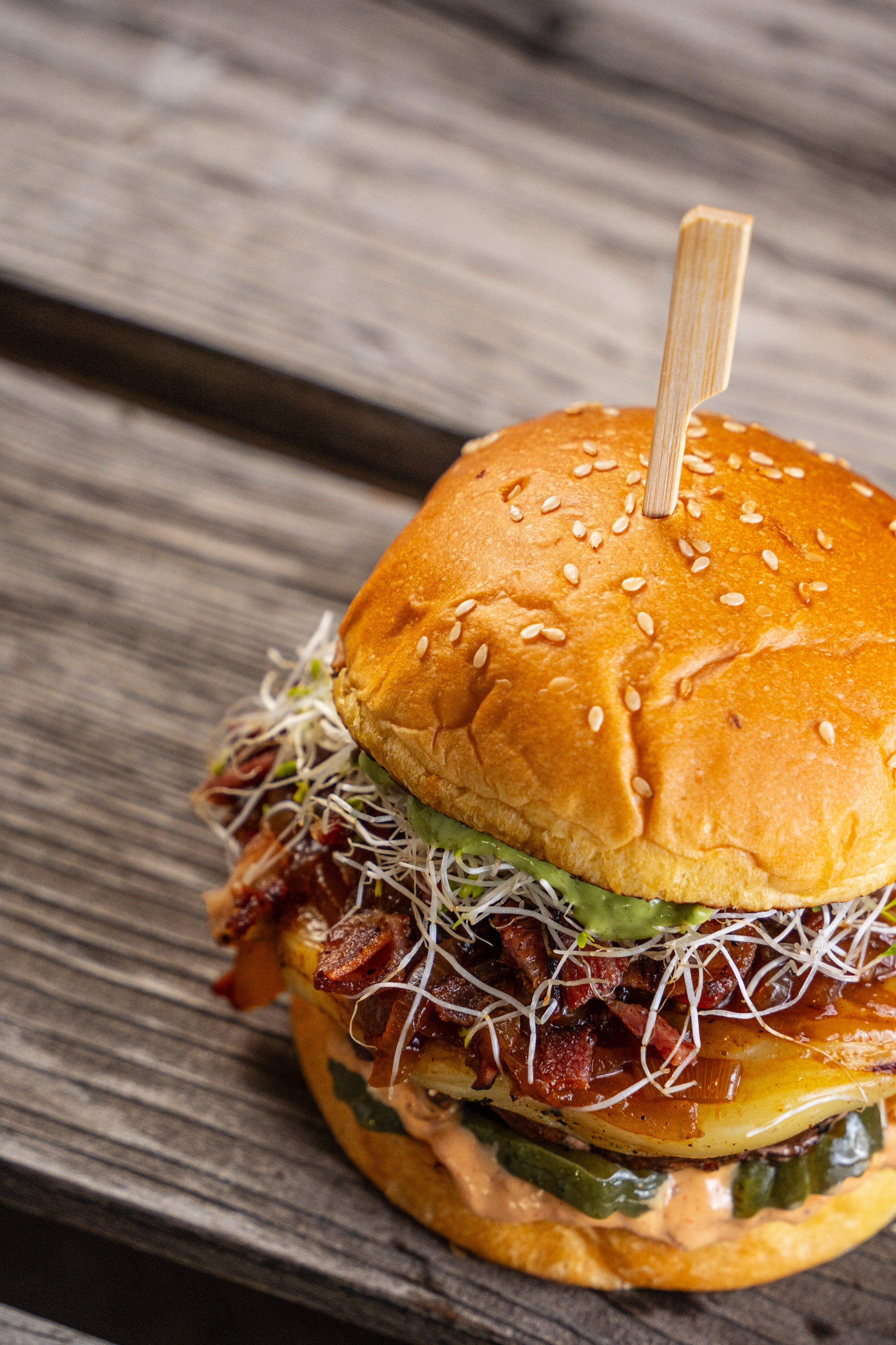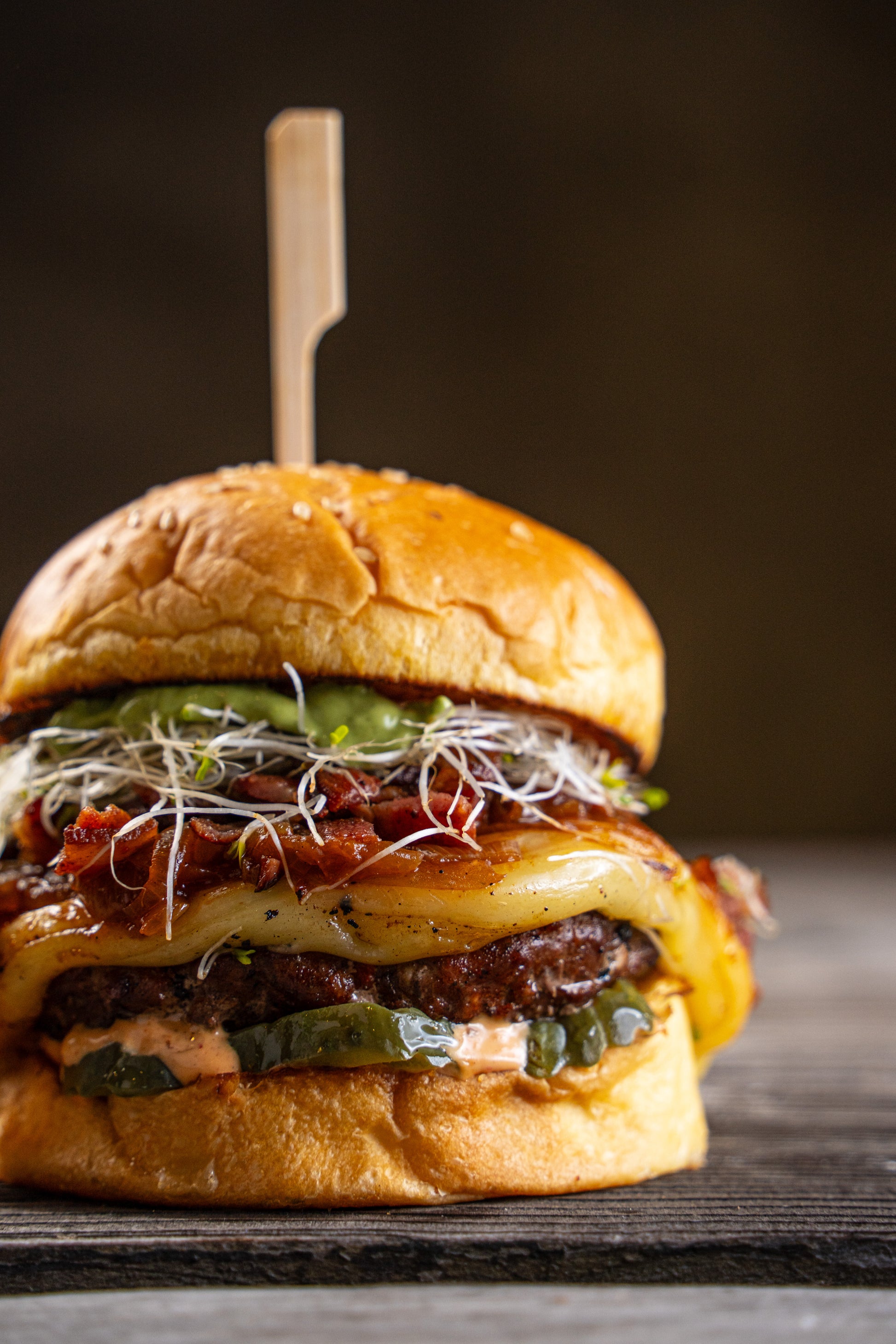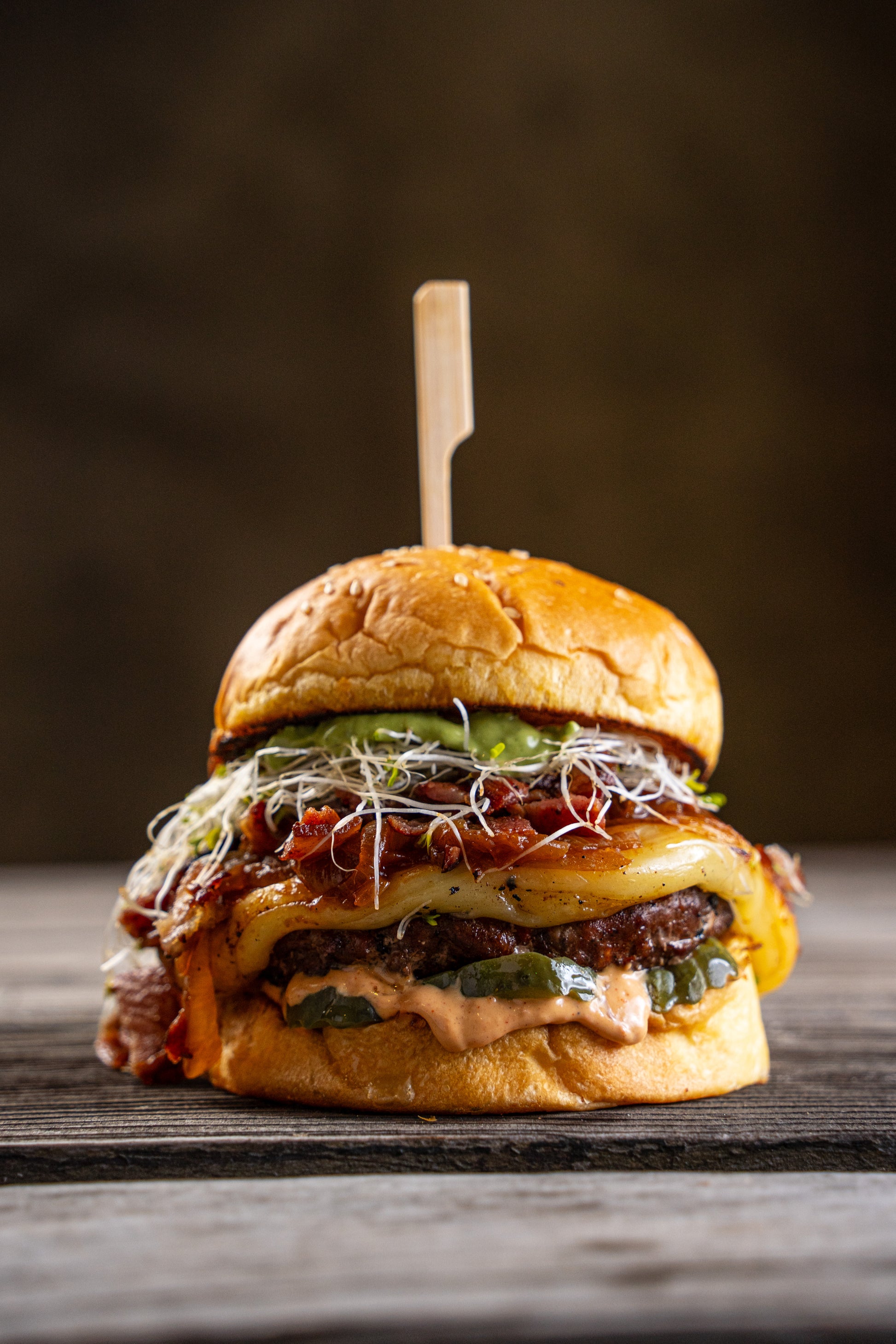 150gr de Solomo Angus al Grill, sobre una base de Salsa de Ají Dulce, coronada con Queso Holandés Gratinado, Tocineta, Cebolla Caramelizada y Pepinillos, bañada con MayoPesto.